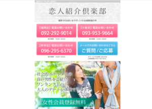 恋人紹介倶楽部は、福岡市内、北九州市内、熊本市内を中心に大人の出会いをサポートしている会員制紹介所です。20年以上運営されている老舗で、会員の方々に充分に大人の恋愛を楽しんでもらえるようサービスを提供しています。