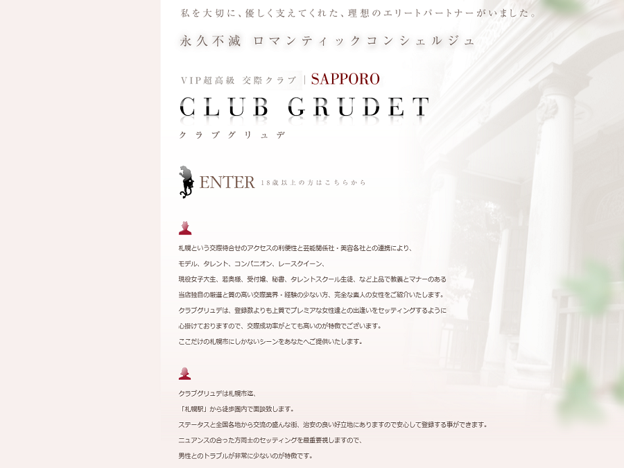 ・年収1,000万円以上 ・精神的・経済的に余裕のある紳士 ・顔写真付き身分証、または保険証+公共料金請求書の提示が可能な方 ・クラブグリュデの品格、ステータスを遵守いただける方 |