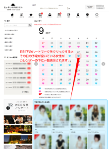 自動セッティングカレンダー機能は、女性会員が自分の都合の良い日をカレンダーに入力、男性会員はそのカレンダーを確認し、女性会員のスケジュールに合わせたオファーをすることができます。