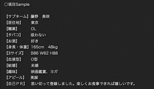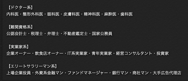 また、金額を非公開にしている理由は会員の方々との信頼関係を何よりも早く築くことに注力したいとの考えによるもので、紹介料(セッティング料)も女性によってことなると明記されているだけで、ランクや金額も公開されていません。