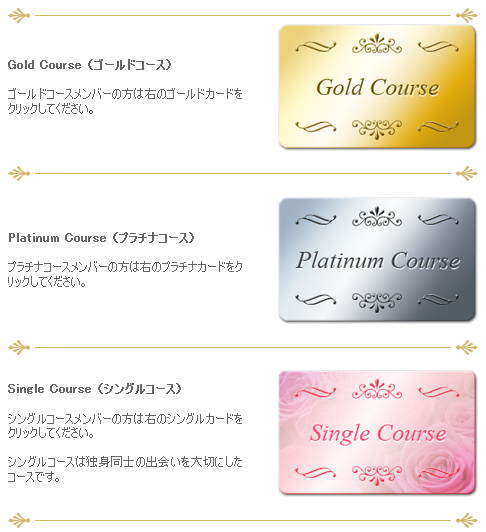 営業地域のほかには、複数設けられている会員ランクも特徴的で、「人と人との出会いは、何ものにも変えがたい財産」という女性オーナーの思いから誕生した独身専用コース(シングルコース)もあります。