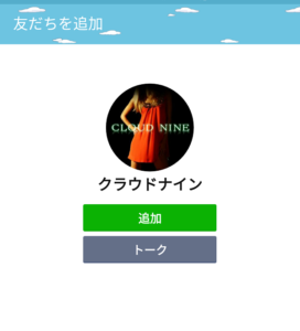 上のQRコードを読み取ると、クラウドナインのLINEアカウントが出てきます。