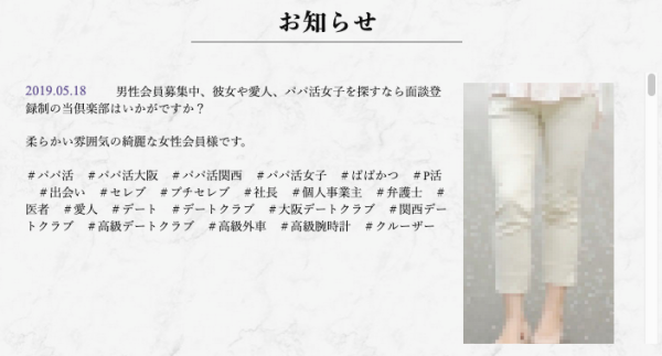 サイトトップのお知らせには、新規入会女性のモザイク処理された脚の画像に簡単な文章を添えたものが掲載されています。