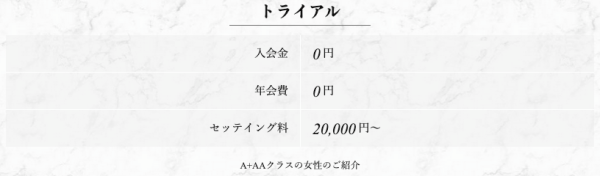 大阪の交際クラブは東京の交際クラブと比較して安価な店舗が多いのですが、クラブキューブの料金設定も最上位ランクのプラチナ会員でも入会金100,000円、セッティング料も20,000円~ととても利用しやすい料金設定になっています。