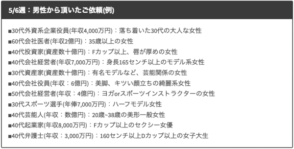 また、サイト内のFOR LADY にはClub SSに寄せられたリクエストを掲載しており、どのような女性が求められているのかが分かりやすいです。