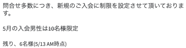 毎月男性会員の新規入会数に制限を設けているため、入会条件を満たしているからといって必ず入会できるとは限りません。
