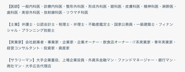 実業家や士業、医師など正真正銘ハイクラスと呼ぶにふさわしい方々が入会を許可されています。