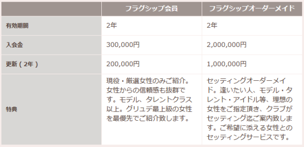 通常の料金も他の交際クラブと比較しても高額なのですが、フラグシップになると桁違いに高額な設定となっています。