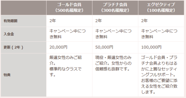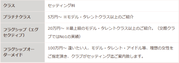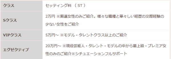 セッティング料やセッティングされる女性会員のステータスは以下のとおりとなっています。