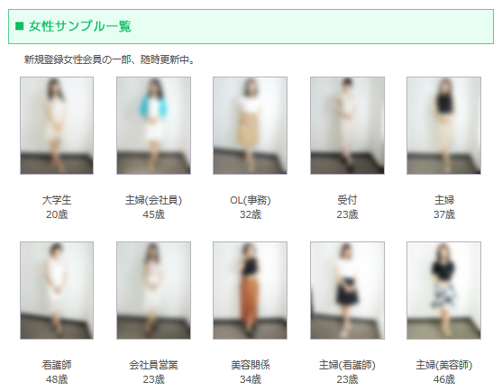 SAMPLEのページをご覧いただけると分かるとおり、女性会員の年齢層も幅広く落ち着いた雰囲気の大人の一般女性が登録しています。