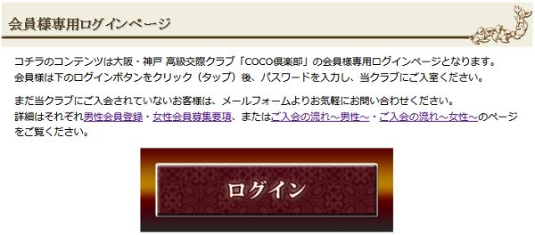 COCO倶楽部では、男性会員・女性会員のみがアクセスできる会員専用サイトが用意されており、入会手続き完了次第、ログインIDとパスワードが発行され、利用可能となります。