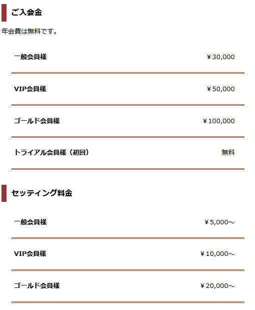 “高級交際クラブ”と謳っていはいますが、年会費も不要ですし入会金やセッティング料金は同じエリアで営業している交際クラブ・デートクラブと比較しても非常に安価に抑えられており、コンセプト通りの気軽な出会いが実現できる設定です。