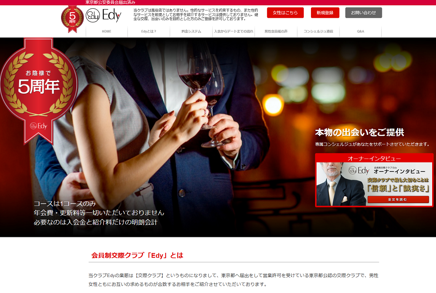 Edy(エディ)は、会員一人ひとりの「信頼」と会員の皆様に「誠実」な運営を心がけている交際クラブです。
