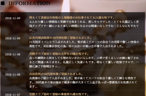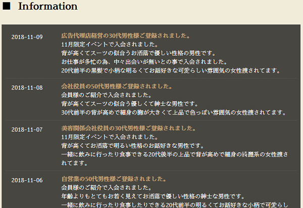 そして、男性会員の入会情報も公開されており、こちらは女性へのご案内ページのInfomationで確認できます。