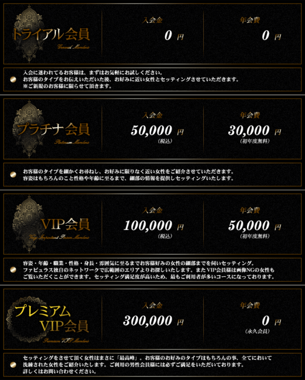 ファビュラス東京の会員ランクと利用料金は以下のように設定されています。