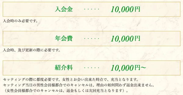 会員ランクは設定されておらず、入会金・年会費が10,000円と高級交際クラブが多い銀座のなかでは最安値となっています。
