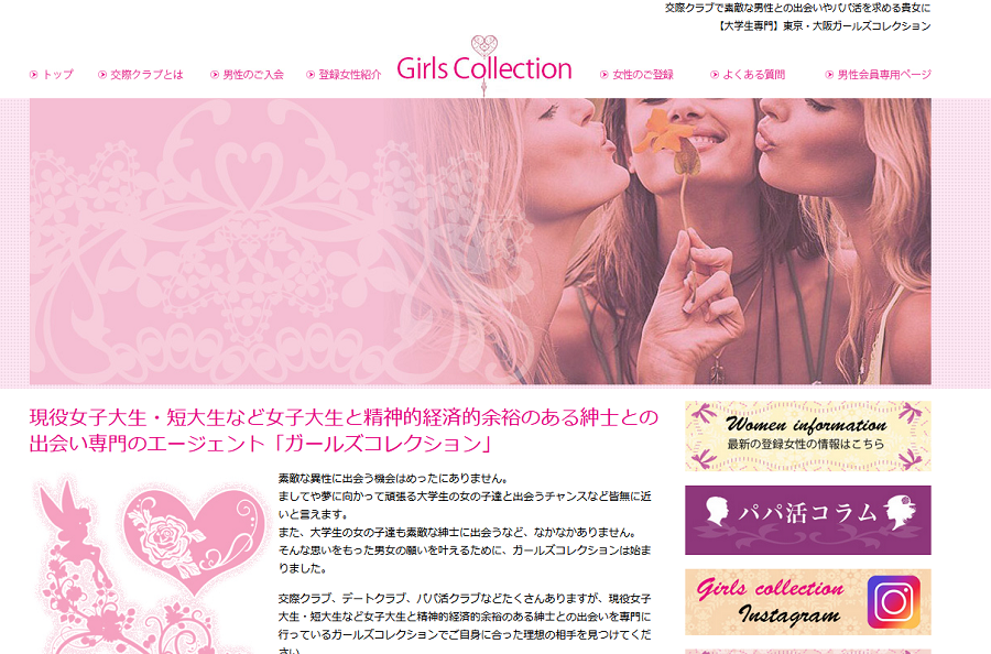 ガールズコレクションは、東京と大阪で営業している、夢に向かって頑張る女子大生たちと精神的・経済的に余裕のある紳士との出会いを提供している交際クラブです。