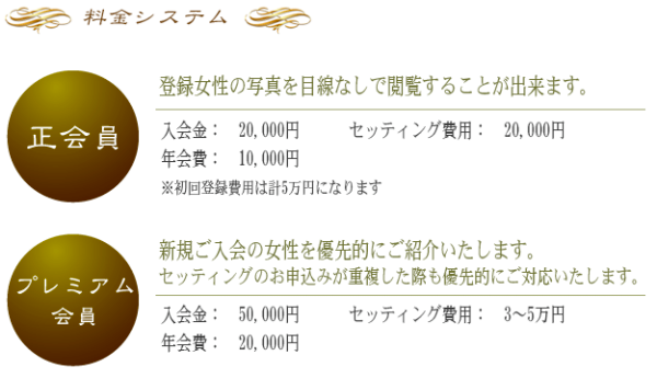 高級会員制交際クラブとうたっているわりには、プレミアム会員でも入会金50,000円と他の交際クラブ・デートクラブと比較しても非常に安価な設定です。