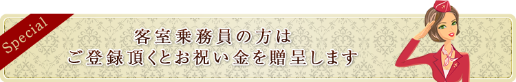 特にCA(客室乗務員)の方の集客に力を入れており、登録するとお祝い金の進呈があります。