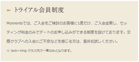 入会を検討中の方に1回限りでセッティング料金のみでモーメンツの女性会員とのセッティングが体験できるというものです。
