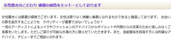 “紹介できる水準の方にはメイクやファッション、内面からの充実のために惜しみなく指導いたします”