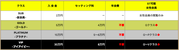 女性会員はクラス分けされており、ランク毎にセッティング可能なクラスが異なります。