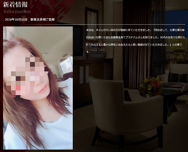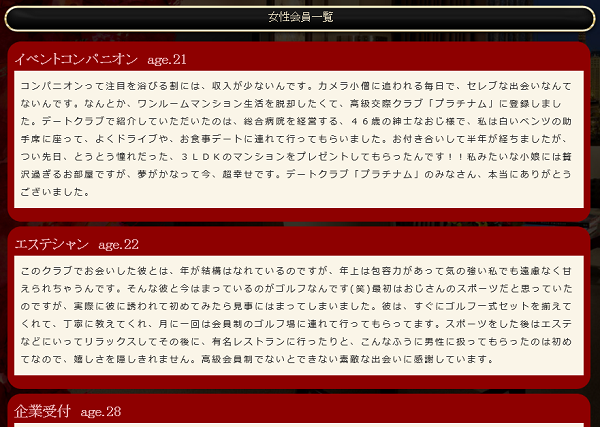 そして、女性会員紹介ページでは、大阪プラチナムを利用した感想が掲載されているだけです。