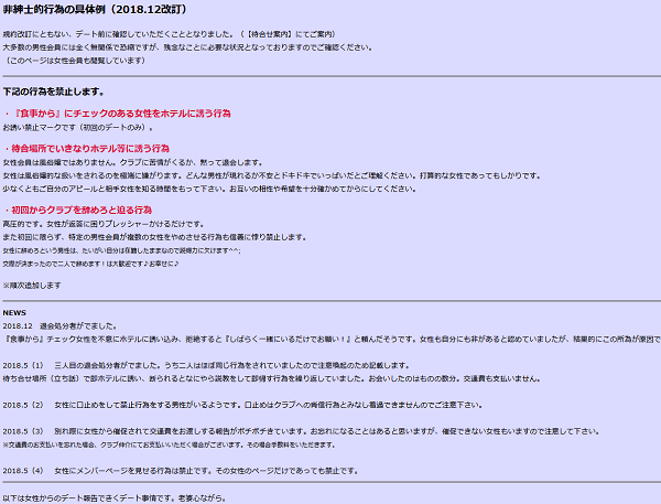 また『デート前の確認事項』(随時更新)では、非紳士的な禁止行為の具体例や退会処分者が退会になった理由が記載されています。