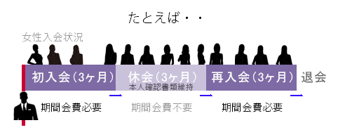 なぜ3か月ごとの更新かといいますと、横浜キャラントの男性会員の方々は長期的な交際を希望する方が非常に多く、1年後との更新だと女性会員との交際が始まり利用しなくても会員の資格を保有したままという無駄な期間が多くなってしまうためです。