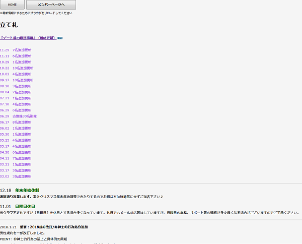 掲示板では新規入会情報、定休日のお知らせなどが更新されています。
