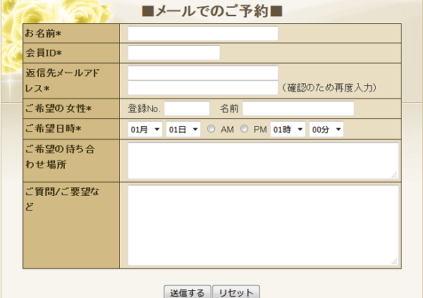 登録女性一覧から気になる女性が見付かったら、専用フォームを利用したメールでのセッティング予約ができます。