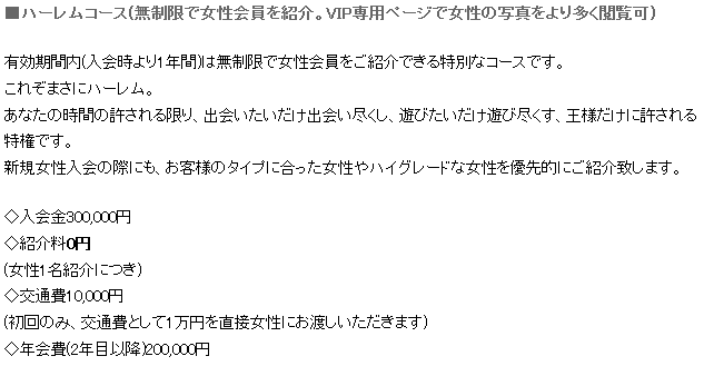 ハーレムコースとは、入会金300,000円(2年目以降年会費200,000円)で紹介料無料、無制限でセッティングが楽しめるコースです。