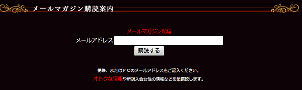 パソコン、スマホのメールアドレスが登録でき、お得なキャンペーン情報や新規入会女性の情報などをいち早くチェックできます。