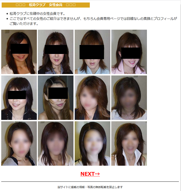 松涛クラブのサイトをご覧になった方にはお分かりいただけるかと思いますが、サイトに掲載されている女性の顔写真にはすべて目線とぼかし処理がされています。