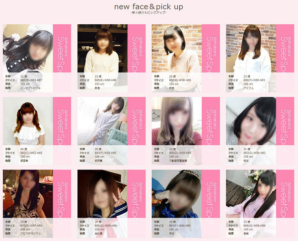 また、トップページに掲載されている新人紹介&ピックアップをご覧になるとお分かりいただけるかと思いますが、サイト上に掲載されている女性会員の顔写真にはすべてぼかし処理がされており、詳細なプロフィールなどは一切掲載されていません。