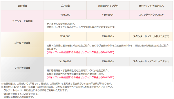 現在は女性会員もランク分けされており、ランクによってセッティング料金が異なるシステムに変更され、デートクラブというより交際クラブに近い設定となりました。