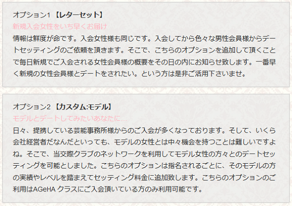 女性は容姿と品性、教養などを総合的に審査した上で入会が許可されており、実際に会ったときにイメージと違ってがっかり…とならないように努力しています。