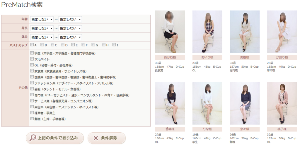 検索フォームに希望する条件を入力すると、その条件に合った女性会員が絞り込めます。